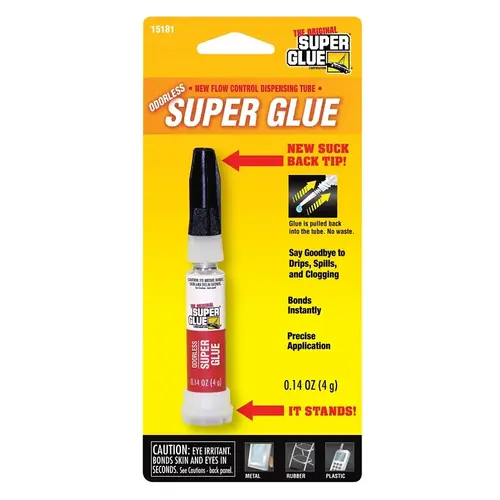 Odorless Super Glue is in a patented smart tube dispenser. The unique "suck back" tip pulls the unused glue back into the dispenser helping to prevent clogs, drips and waste. This dispenser lasts as long as an aluminum tube but stands up like a dispenser. Plus, the odorless formula does not have the irritating smell of a traditional Super Glue. All this and it still instantly bonds metal, rubber, aluminum, china and more!.