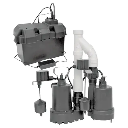 Includes: 0.3 hp Sump Pump 12 VDC Back-Up Pump (2) 1-1/2 in Check Valves Pipe and Fittings