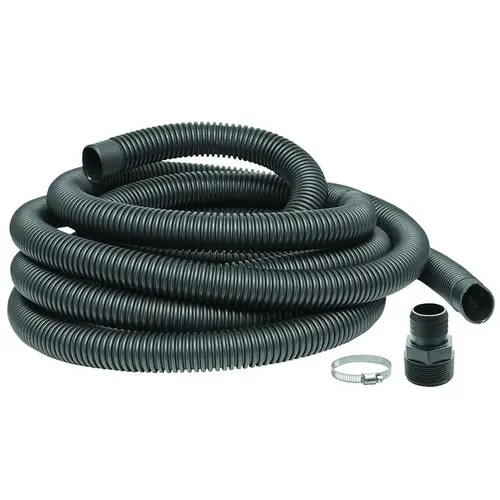 Work with all pumps with a discharge size of 1-1/4 in or 1-1/2 in. For permanent or temporary use. 24 ft poly drainage tubing. Includes 1-1/4 in and 1-1/2 in adapters with rust-resistant hose clamps.