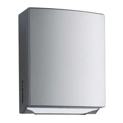 Tumbler Lock on Top of Cabinet, Door Swings Down for Loading Towels, Dispenses 400 C-fold or 525 Multifold Towels, Cabinet Slots indicate Refill Time