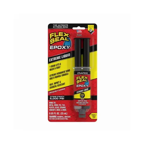 Flex Seal Family: Flex Seal Epoxy Extreme Liquid Black 25ml Syringe advanced multi-purpose, rapid-cure adhesive features a non-sag formula. The ultimate in Extreme bonding 6,000 PSI. Vertical application. Lifts and holds 8 tons* 25 minute open work time and 3-6 hour set time. Fully cures in 15-24 hours (1 hour with heat). Fill cracks, and gaps. Extremely durable waterproof, heat, impact, and chemical resistant. Extreme Temp. Range Application: 50-110 degreeF. Service: Up to 550 degreeF. Shelf Life: 24 month (unopened). Can be tooled, shaped, sanded, painted and drilled. Bonds to: metal, plastics, concrete, PVC, and more. Excellent for: automotive, marine & plumbing repairs; home, garage & outdoor projects; furniture, appliance, tool & equipment repairs; DIY, crafts & hobbies; emergency fixes; and heavy-duty & industrial application.