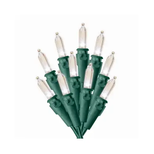 SYLVANIA 50 Count Battery Operated LED Warm White mini lights with auto timer. Green Wire. 16.3' lighted length. 12" lead cord, 4" spacing. Auto timer- 6 hours on / 18 hours off. Requires 1 "D" battery (not included). Indoor/Outdoor use. Color box.