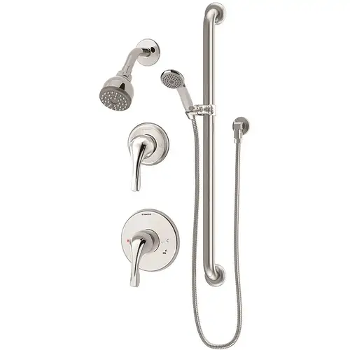 Symmons Origins Hand Shower System. Origins Hand Shower System. Temptrol pressure balancing valve. Adjustable stop screw to limit handle turn. ADA compliant 36" grab bar for hand shower. Without tub spout. Separate dual outlet diverter. Mfg #9605-PLR