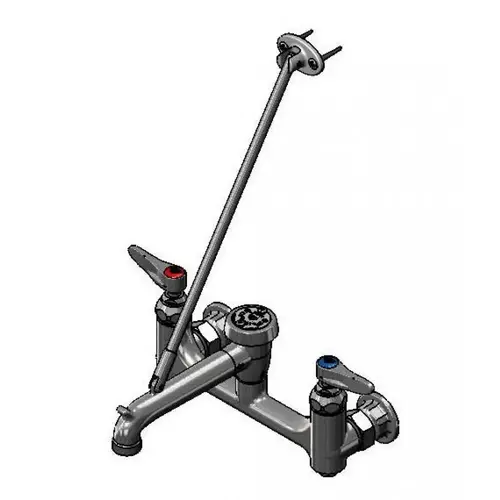T&S Brass And Bronze Service Sink Faucet Wall Mount. 8" Wall Mount Mixing Faucet With Rough Chrome Plated Brass Body. Vacuum Breaker Spout With Pail Hook & 3/4" Garden Hose Outlet. Quarter-Turn Eterna Compression Cartridges With Spring Checks To Prevent Cross Flow Of Water. Lever Handles With Color Coded Indexes. 1/2" Npt Female Eccentric Inlets With 2" Flanges. Adjustable Centers From 7 3/4" To 8 1/4". Built-In Service Stops In Body. Upper Support Rod. Material: Rough Chrome Plated Brass Body & Spout And Chrome Plated Metal Handles. B-0665-BSTR