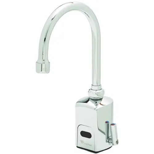 Single hole deck mount electronic sensor faucet with polished chrome plated brass body and 5-7/16 in. swivel gooseneck, 0.5 GPM vandal resistant non-aerated spray device, above deck electronic AC/DC control module with internal flow control setting switches, above deck temperature mixing handle, anti-rotation pin, 18 in. flexible stainless steel supply hoses and check valve adapters with 3/8 in. compression connections. Certified to ASME A112.18.1/CSA B125.1, NSF 61-Section 9, NSF 372 and UL 1951. Meets ADA ANSI/ICC A117.1 requirements.