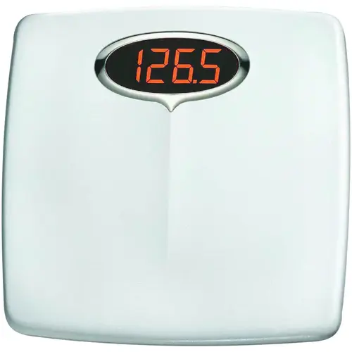Bathroom Scale, 330 lb Capacity, LED Display, Styrene Housing Material, White, 13-1/2 in OAW, 14 in OAD