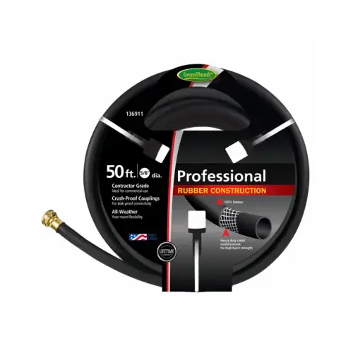 Green Thumb, 5/8" x 50', Black Rubber Garden Hose, Solid Crush-Proof Brass Couplings, All-Weather, Heavy Duty Radial Reinforcement For High Burst Strength, Lifetime Warranty.