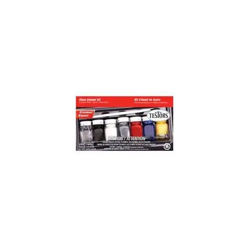 Kit includes thinner, paintbrush, tray and six colors: red, dark blue, yellow, white, silver, black.