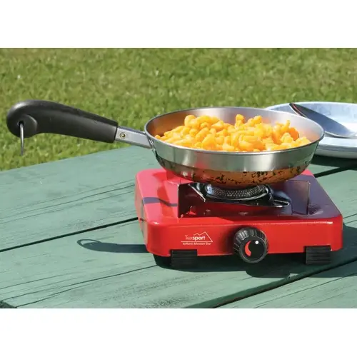 Square shaped pot holder with wind baffles. Adjustable burner provides up to 5,500 Btu's. Baked enamel finish on heavy-gauge steel. Pressure regulator brass valve. Metal socket injector valve fits either 16.4 oz or 14.1 oz disposable propane cylinder (not included).