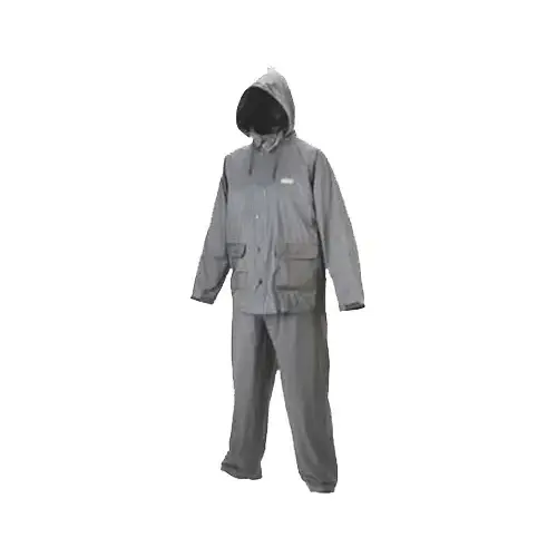 Adult, Large, Black, Rain Suit, .20 mm PVC, Pants & Jacket, Zipper Jacket Front With Snap Close Storm Flap, Drawstring Adjustable Hood, Snap Close Pockets, Covered Back Vents, Drawstring Waist On Pants, Snap Adjustable Sleeve & Leg Cuffs.