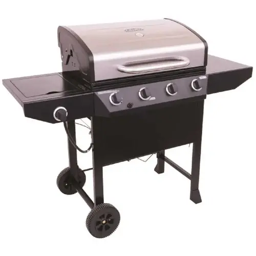 The Thermos 4-Burner Gas Grill features 48,000 BTUs of cooking power spread across 480 square inches of primary cooking space. Stainless steel burners are rust-resistant and the porcelain-coated grates keep food from sticking and are easy to clean. Equipped with a 10,000 BTU side burner, metal side shelves, built-in tool hooks for storage, a Piezo ignition system, and porcelain-coated steel lid and firebox designed to withstand the elements. This grill also features two 6 in. wheels and stationary legs for easy portability and stability.