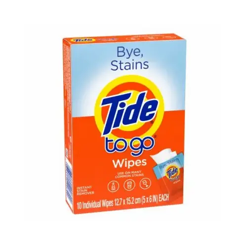 Tide To Go Wipes are our most convenient instant stain remover ever for common stain emergencies like coffee, wine, ketchup, sauce or juice. Safe to use on most fabrics as they do not contain bleach. Each cloth wipe is individually wrapped and easy to dispose so you don't need to worry about drying out. Perfect to keep in the car or the office. Tide To Go Stain Remover Wipes are ultra-portable and easily fit in your pocket, wallet or purse. Easy to use. Blot the stain with Tide To Go Wipes working from the outside of the stain towards the center. If necessary, remove excess stain first. Don't forget to rinse your hands once you are done.