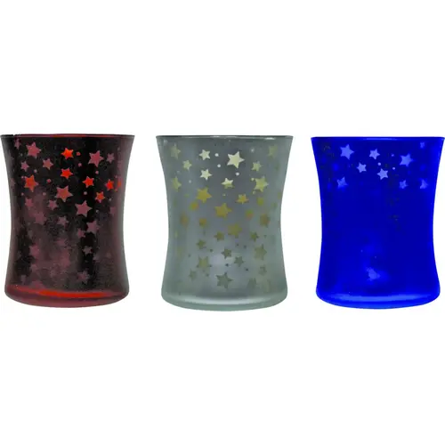 Americana inspired citronella glass candle. Pattern illuminates when candle is lit. Assortment: red, white and blue candles with star pattern. Burns up to 50 hrs.