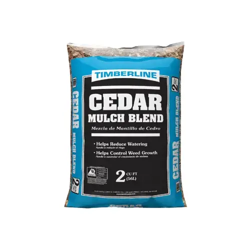 Timberline Premium 2 cu.ft. All Natural Cedar Mulch Blend. It is a shredded cedar mulch blend that comes in a 2 cubic feet bag. It has a natural brown color and provides 12 sq. ft. coverage at a 2-inch depth.