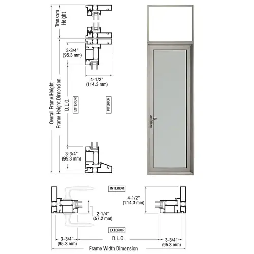 The CRL Series 900 Terrace Door is a custom thermally broken entrance built with a 1" x 4-1/2" x 120" (25 mm x 114 mm x 3.05 m) transom frame, a medium stile 2-1/4" (57 mm) thick door with 3-3/4" (95 mm) stiles, 1-1/2 pair of offset adjustable pivot hinges, a 3-3/4" (95 mm) top rail, and a 3-3/4" (95 mm) bottom rail. Standard features include a five-point locking device and a standard matching finish aluminum threshold.