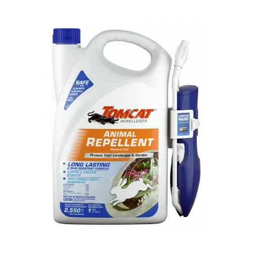 It's the moment every gardener dreads, you walk out to enjoy your beautiful garden and are met by plants that have been so chewed up that they are unrecognizable. Tomcat repellents animal repellent ready-to-use protects your landscape and garden from this greenery assault. The smell and taste of Tomcat repellents animal repellent ready-to-use is unpleasant to animals like rabbits, squirrels and groundhogs. Its long lasting, rain resistant formula is safe to use on edible fruits and vegetables as well as around people and pets when used as directed.
