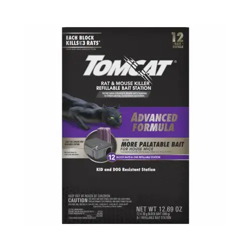 Advanced formula uses an advanced formulation bait block that is more attractive to house mice (compared to the Tomcat rat and mouse killer child and dog-resistant, refillable station [EPA Reg. No. 90780-11]). This refillable bait station can be placed horizontally or vertically indoors or outdoors to control Norway rats, roof rats and house mice. The station is resistant to weather and to tampering by children and dogs. Each block of bait can kill up to three rats (based on no choice laboratory testing). Bait stations with mouse and rat poison should be placed beside burrows, along walls, behind kitchen appliances, in corners, along the exterior of a home and in basements, attics and garages. If more than one station is being used, place them at 15 to 30 ft intervals. Each Tomcat rat and mouse killer refillable bait station has a clear cover to make it easy to monitor - when there is no more bait in the station, easily refill it with one of the provided bait blocks.