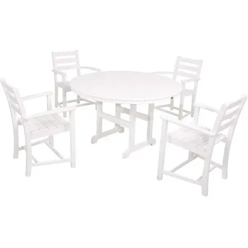 Laughter and conversation will flow a little more freely when everyones gathered around the Trex Outdoor Furniture Monterey Bay 5-Piece Dining Set. This charming set comes with 4 TXD200 Monterey Bay Dining Arm Chairs and a TXRT248 Monterey Bay Round 48 in. Dining Table. it is also available in several fade resistant colors that are designed to coordinate perfectly with your Trex deck. With solid HDPE lumber construction, this all-weather set is built for durability, low-maintenance and lasting good looks and even comes with a 20-year warranty to back it up. Unlike real wood furniture, this set will not rot, crack or splinter. Nor does it ever need to be painted or stained. it is also easy to keep clean since it resists weather, food and beverage stains and environmental stresses.