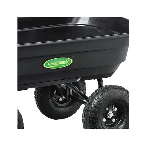 Green Thumb, Poly Dumping Garden Cart, Patented Quick Release Dumping Feature, Back Wheels Pivot Forward To Ensure Smooth Operation & Easy Dumping, 4 Wheel Design Maximizes Stability On All Terrains, Maintenance Free & Rust Free Poly Bed, 10" Pneumatic Tires With Steel Rims, Zinc Plated Hardware, 500 LB Weight Capacity.