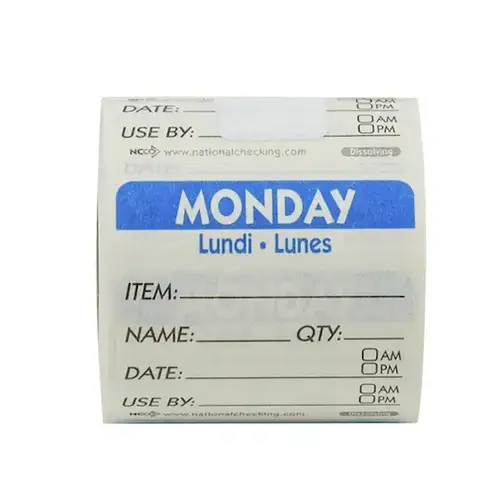 2" x 2" Dissolving Item/Date/Use By Trilingual Labels Monday
