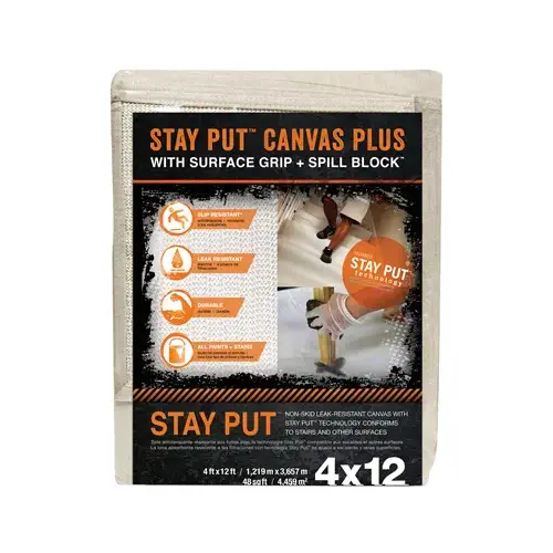 The Trimaco Stay Put Canvas Plus gives you leak-resistant protection that stays put where you place it. The canvas drop cloth consists of three layers - absorbent canvas fabric, leak-resistant plastic, and a durable non-slip backing. Use the canvas side up to keep tracking paint to a minimum. The plastic drop cloth side helps prevent leaks for all paint spills and stains. Reduce messy clean ups by protecting your home with the Trimaco Stay Put Canvas Plus.