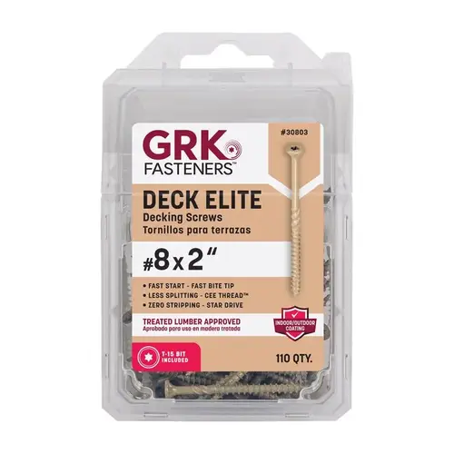 GRK’s Deck Elite screws are designed for use in wood deck boards and provide a quick drive and clean finish. Deck Elite screws start immediately in wood with a smooth, fast drive to increase productivity on the job and the tan color of the screw provides an ideal finish.