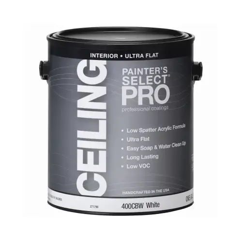 Painters Select Pro 400, Gallon, Brite White, Flat Latex Ceiling Paint. Non spatter formula for less mess. Cleans up with soap and water. 15 year warranty and VOC less than 50 grams per litre.