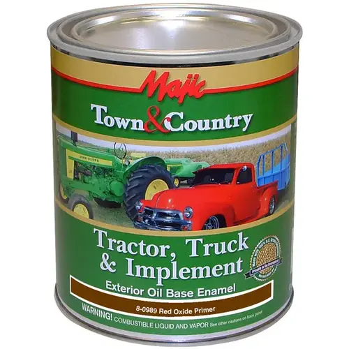 8-0989-2, Majic Town & Country Tractor, Quart, Red Oxide Primer Truck and Implement Enamel, is a durable, heavy-duty alkyd enamel specially formulated for excellent adhesion, and resistance to weathering and corrosion. It can be applied with brush or spray and dries quickly to a high gloss finish. Use it on iron, steel, aluminum and properly primed galvanized metal.