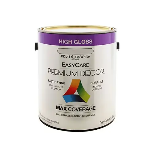 PDL1-GL, EasyCare Premium Decor, Gallon, White, Gloss Finish, Waterborne Enamel, Durable, Quick Drying, Mar Resistant, 100% Acrylic, Low Odor, Fade & Chalk Resistant Formula, Easy Soap & Water Clean Up, VOC Less Than 50 Grams Per Litre, Item May Be VOC Restricted In Certain Areas, Please Refer To The Restricted Items Report On MOL For A List Of Items That Are Restricted In Your Area.