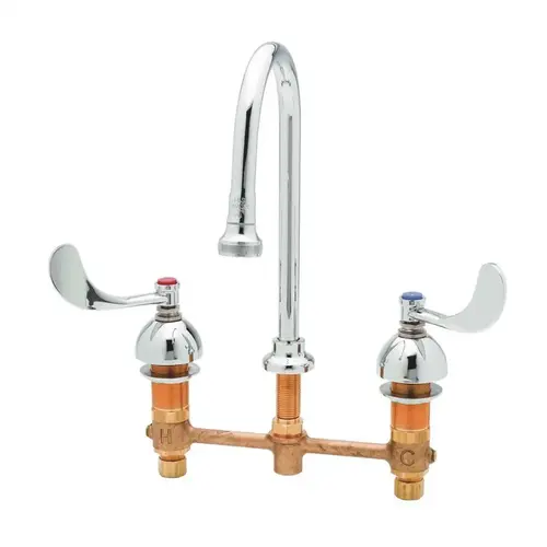 The 8 in. concealed deck mounted faucet is a polished chrome plated forged brass body. This will contain a rigid gooseneck spout with rose spray outlet. Also includes 4 in. wrist blade handles and chrome plated bell escutcheon.