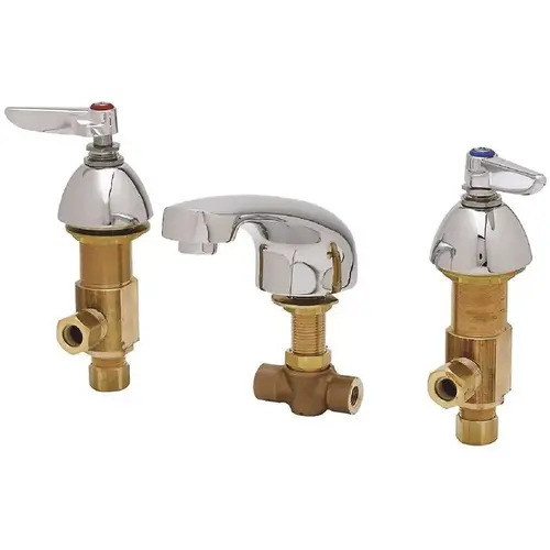 T&S Brass 24 in. maximum concealed deck mount mixing faucet with brass body, polished chrome plated cast spout with 2.2 GPM aerator, compression cartridges. Includes flexible supplies, lever handles, polished chrome plated escutcheons and 1/2 in. NPSM male inlets with coupling nuts. Certified to ASME A112.18.1/CSA B125.1, NSF 61-Section 9 and NSI 372. Meets ADA ANSI/ICC A117.1 requirements.