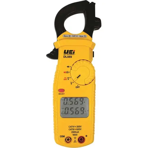 UEI Test Instruments 400A Dual Display Clamp Meter With Test Lead Storage High-voltage alert Low battery indicator Auto ranging Min/Max/Hold Test Lead Storage Easy access battery cover latches Mfg #DL569