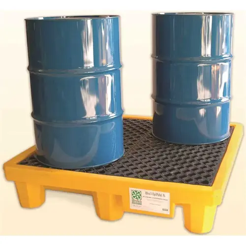 High Load Capacity 6,000 lbs. for 4-Drum Model. Bright, Safety Yellow Sidewalls are translucent, offering convenient visual leak detection. 100% polyethylene construction compatible with a broad range of chemicals, including acids and corrosives. Meets SPCC, EPA and Uniform Fire Code Containment Pallet Regulations.