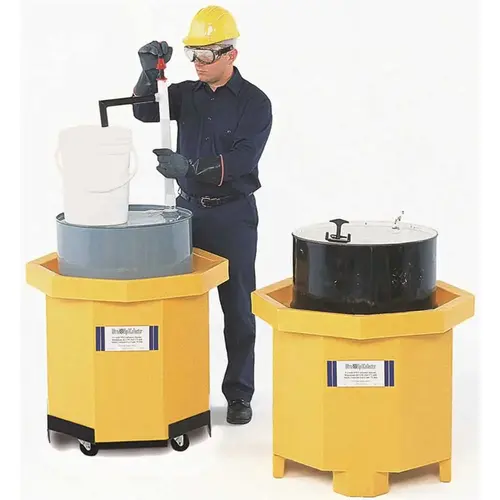 Applications include satellite waste collection, general storage of chemical drums and portable drum pumping stations. Rugged design allows Flat Bottom Model and Pallet Jack Model to be safely handled by forklift under top flange. 66 gallon containment capacity. Meets SPCC and EPA Container Storage Regulation 40 CFR 264.175