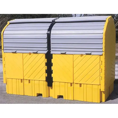 Uses same sump as Ultra Twin-IBC Spill Pallet. Unique, lockable, dual closure allows quick access to tanks. Roll-top covers can be easily lifted for routine visual inspection. Swing-out doors provide safety and convenience for loading/unloading tanks. Safely stores IBC tanks, with maximum dimensions of 52 x 52 x 61. Meets Stormwater, SPCC and EPA Containment Regulations