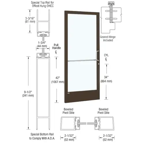 CRL-U.S. Aluminum CD21922R036105 Bronze Black Anodized 250 Series Narrow Stile (LHR) HLSO Single 3'0 x 7'0 Offset Hung with Geared Hinged for OHCC 105 degree Closer Complete ADA Door(s) with Lock Indicator, Cyl Guard
