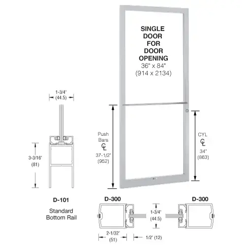 These center pivot doors include standard 2" (51 mm) stiles, 2-1/8" (54 mm) top rails, and your choice of standard 3-3/16" (81 mm) bottom rails or 9-1/2" (241 mm) ADA access bottom rails. Other standard features include a push bar, lock, lock indicator, cylinder and cylinder guards, glass stops, and glazing gaskets. You supply the 1/4" (6 mm) clear tempered glass.