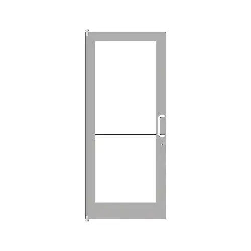 This CRL Clear Anodized Offset Pivot Entrance Door is a single door 36" x 84" (914 mm x 2.13 m) and is built with standard 3-1/2" (89 mm) Stiles, 3-3/16" (81 mm) Top Rail, and Standard 6-1/2" (165 mm) Bottom Rail. Other standard features include a Push Bar, Offset Pull Handle, Hookbolt Lock, Lock Indicator, Cylinder and Cylinder Guard, Glass Stops, and Glazing Gaskets.