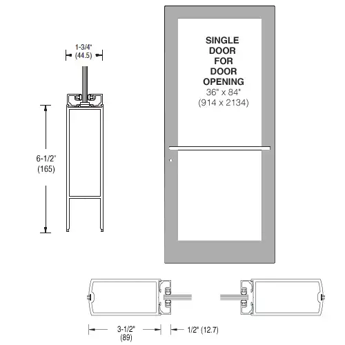 CRL Stock Size CD and DC Series 400 Medium Stile Center Pivot Doors are singles doors 36" x 84" (914 mm x 2.13 m) and built with 3-1/2" (80 mm) stiles, 3-3/16 (81 mm) top rail, 6-1/2" (165 mm) bottom rail, and are prepped for center hung overhead concealed closer. They come complete with standard push bars, hookbolt, and cylinders.