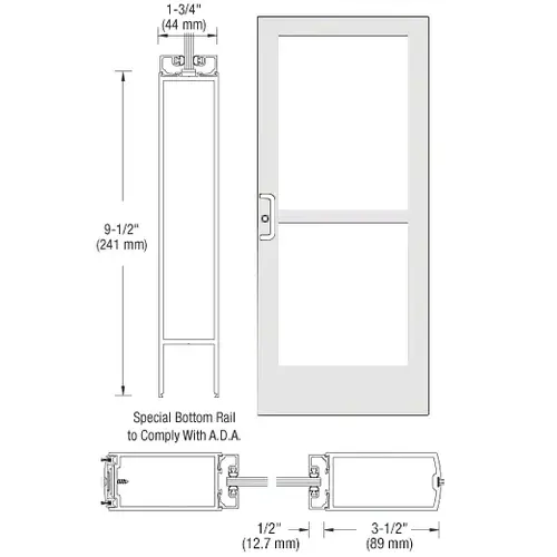 This Standard Medium Stile Entrance Door is built with 3-1/2" (89 mm) Stiles, 3-3/16" (81 mm) Top Rail, and 9-1/2" (241 mm) Bottom Rail. Standard features include stiles for Center Pivot hardware, glass stops for 1/4" (6 mm) tempered glass (by others), and all standard hardware and fabrication.