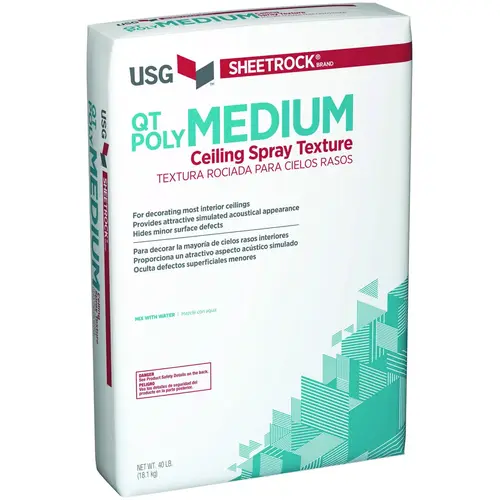 For bold acoustical appearance on interior ceilings. Massive aggregate with white background. Exceptional hide and leveling qualities. Mixed with water at jobsite, requires no extended soaking or mixing, even in cold water. Bonds to new or old concrete, gypsum panels and plaster; levels minor surface irregularities, masks surface defects and has superior resistance to fissure-cracking in normal thicknesses. Dries to a crisp white finish. Paintable, not washable unpainted. Fast pumping, low-cost spray application. Dries to touch in 1 to 2 hrs. Covers up to 8 to 10 sq-ft/lb.