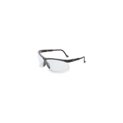 Uvex Genesis Safety Eyewear offers a dual 9-base wrap-around lens providing uncompromised peripheral vision, superior coverage and adjustable temple length and lens inclination. Nosepiece with soft flexible fingers" conform to almost any nasal profile and reduce slippage. Black frame, clear lens. Made in USA. 10 per box