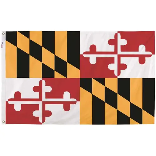 This beautiful 3 ft. x 5 ft. nylon Maryland state flag is constructed with 100% nylon. The state flag emblem is accurately reproduced to fine detail. This flag comes with a heading and brass grommets for easy flagpole attachment.