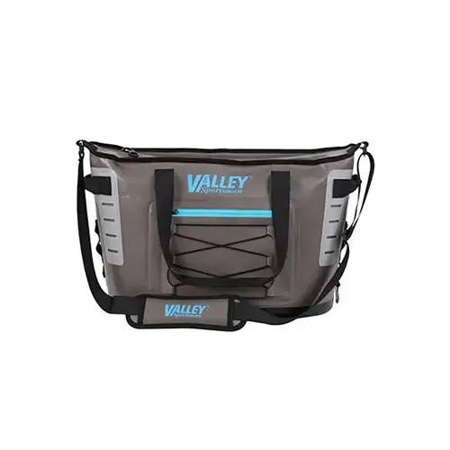 Valley Sportsman, 30 Can Soft Tote Cooler Bag, Gray Body With Teal Accents, 840D TPU, 420D TPU & PE Foam, Withstand The Hazards Of The Wild & Keep Your Contents Nice & Frosty, Designed Body For Easier Loading & Unloading, Dry Material, Closed Cell Insulation, Heavy Duty Nylon Shell, Waterproof Zipper, Anti-Microbial Liner, Easy Access Lid, Light Weight & Durable, No Sweat Exterior.