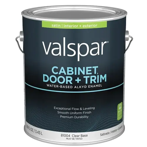 Valspar Cabinet, Door, & Trim Waterborne Alkyd Enamel is a premium quality coating that offers superb flow and leveling, and a smooth durable finish. Provides the convenience and ease of use of a waterborne coating with the application and performance of a traditional oil-based paint. Dry to touch: 1 to 2 hours. Time to recoat: 4 hours. Easy to apply and cleans up with soap and water. Ideal for use on interior trim, doors, and cabinets. Lifetime warranty.