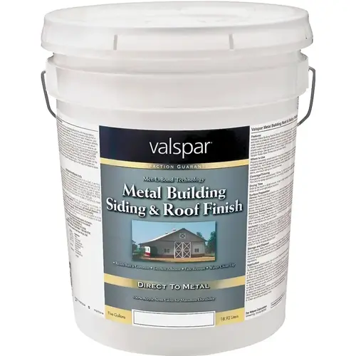 Valspar metal building roof and siding finish restores old, weathered metal siding and roofs to a beautiful appearance and protects against rust. This premium water reducible acrylic formula dries quickly to a long-lasting, durable, fade- and chalk-resistant semi-gloss finish. Cleans up easily with soap and water. Ideal for sloped metal roofs and vertical metal siding on sheds, outbuildings, barns and pole buildings. Use as is for a "Direct to Metal" (DTM) product or use with Valspar rusty metal primer over corroded metals.