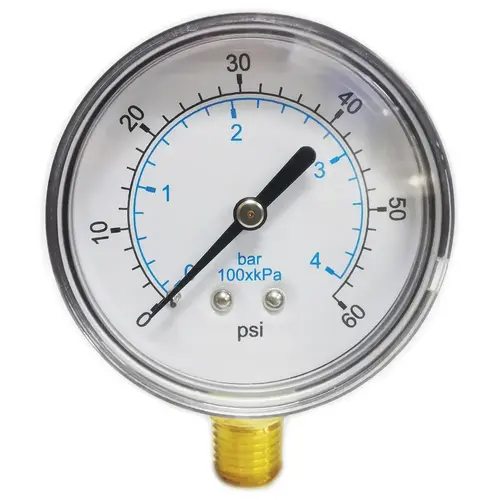 Pressure Gauge: 2-1/2" Dial, 60 psi, 1/4" Thread, NPT, Lower Mount