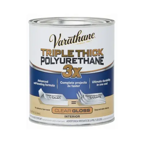 VARATHANE triple thick polyurethane is 3X thicker than a traditional polyurethane. It is an advanced self-leveling formula that allows projects to be completed in one coat while offering excellent scratch and stain resistance. It also provides fast dry times as well as the convenience of soap and water cleanup. It is suitable for use on all interior wood surfaces including furniture, doors, trim and more.