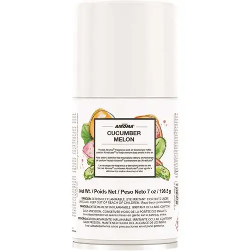 Vectair Airoma Air Freshener Refill 3000 Cucumber Melon Delivers A Refreshing Blend Of Cucumber And Melon Consistent fragrance delivery for up to 30 days Neutralizes bad odors with Airadicate malodor counteractant while adding a crisp aroma Cross compatible: Designed for Airoma dispenser but works with most other aerosol dispensers Perfect for restrooms, offices, and lobbies High-quality aerosol formulation for consistent output Suitable for high-traffic areas CARB compliant Air freshener designed for commercial use Mfg #AIROMA-CUCUMBER