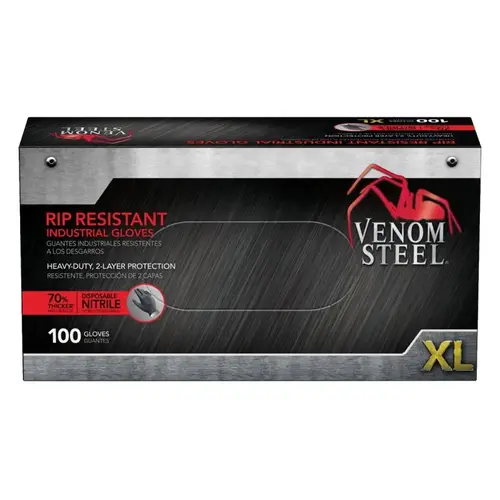 VENOM STEEL Disposable Gloves, XL, Nitrile, Powdered/Powder Free: Powder-Free, Black, 9-1/2 in L, Cuff Type: Beaded, Latex Free: Yes, 6 mil Thick, Resists: Chemical, Dirt, Grease, Puncture, Rip, Tear